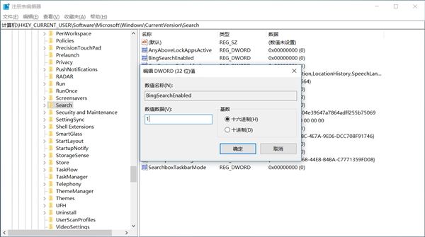 在右侧找到“BingSearchEnabled”,双击将数值从0变为1(代表启用),或者直接删掉这个条目,就OK了。