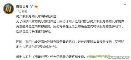 《魔兽世界》怀旧服上线后十分火爆,不少玩家排队,针对这样的问题, 官方 宣布,计划于近期对部分高负载服务器的玩家提供免费的角色定向转移服务。以下为官方公告: