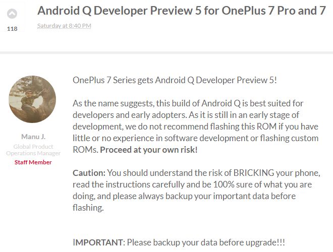 最后,尽管 一加 官网论坛上提供了安装镜像,但帖子中还是建议大家通过之前的开发者预览版本里的 OTA 更新方式来获得。