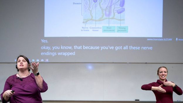美国其他的大型软件供应商也开发了一些技术,来尝试在个人电脑上解读手语。去年,微软与美国国家聋人工学院展开合作,为教室配置台式电脑,然后通过实时翻译员帮助有听力障碍的学生。