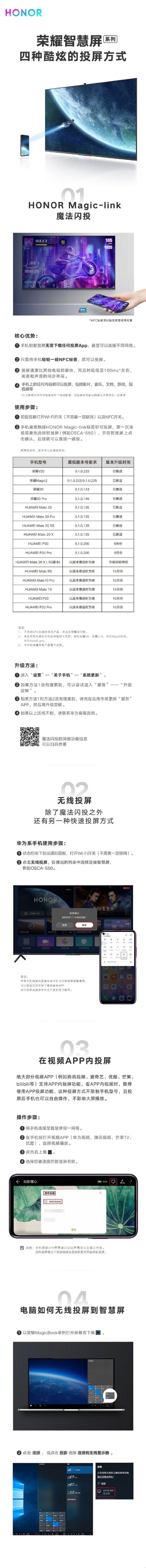 荣耀方面介绍,这种投屏速度比其他电视都要快,而且时延低至100ms左右,画面和声音的同步率高。手机上的任何内容都可以投屏,包括影片、音乐、文档、游戏、短视频等。