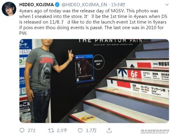 “四年前的今天是MGSV的发售日,这张照片是我当时秘密潜入到商店的合影。《死亡搁浅》将在11月8日发售,是这四年来我的第一款新作。如果可以,我很想在发售时办一个发布会活动,最后一次这么做是2010年的MGSPW,不过现在搞这个可能过时了。”