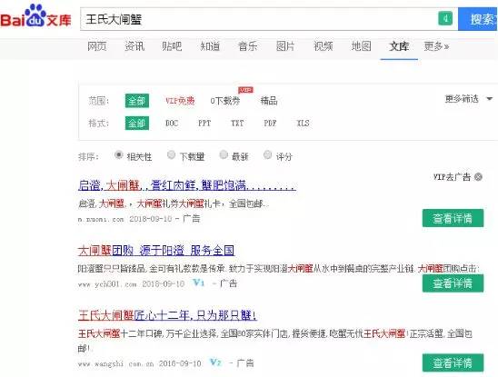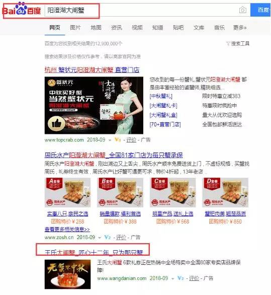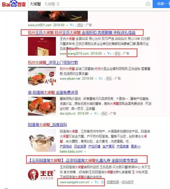 王氏成立于2007年,品牌发展已有十几年之久,随着互联网的爆发,王氏运用网络营销成功铸就了大闸蟹行业龙头品牌。王氏大闸蟹对行业进行超前预判,对行业关键词或者关联词进行百度竞价排行,尤其是与大闸蟹直接相关的关键词,拦截线上流量,转化顾客。并且对主站的不同分站进行竞价投放,使得王氏大闸蟹集中地覆盖在搜索版面上。