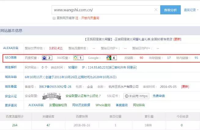 王氏大闸蟹注重官网的优化,其官网经过不断的优化后,成绩可人。百度权重从0上升到了2,与此同时,站内连接数也到达了95。