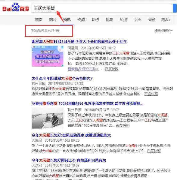 王氏大闸蟹除了注重UGC内容的输出,对PGC内容亦是格外重视。王氏大闸蟹注重对品牌的ePR新闻曝光。王氏大闸蟹在百度新闻上的曝光有281篇。