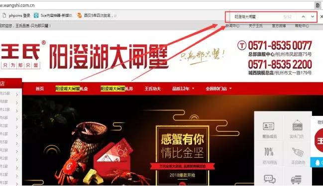 搜索“大闸蟹”关键词,王氏大闸蟹页面出现在搜索前几页。
