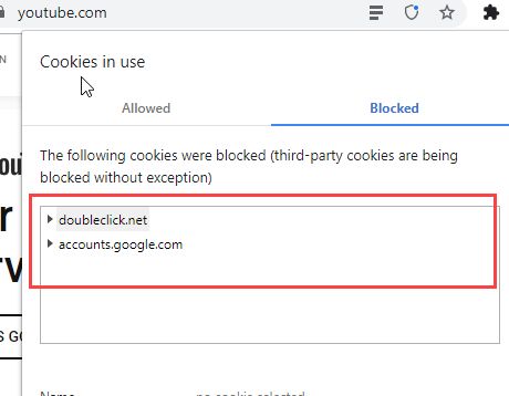 6..现在单击Padlock图标并选择“Cookies”以获取“使用中的Cookie”对话框,其中显示网站上允许和阻止的Cookie,设置白名单和黑名单。访问后者会显示“第三方cookie被无异常阻止”。