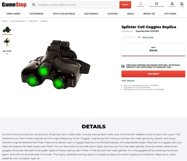 该夜视镜仅为外观复制品,唯一可用的功能就是用4节七号电池点亮脑门上的三盏灯。GameStop在商品描述中直言“第十款纵横谍海(分裂细胞)作品蓄势待发”,令人怀疑育碧近期可能会宣布Splinter Cell新作。
