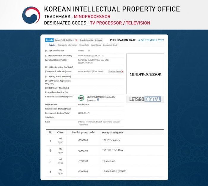 2019 年 9 月 4 日, 三星 电子向韩国知识产权局( KIPO )提交了一个名为“Mind Processor”的商标申请。其注册类别为第 9 类,其中涵盖了 电视 处理器。