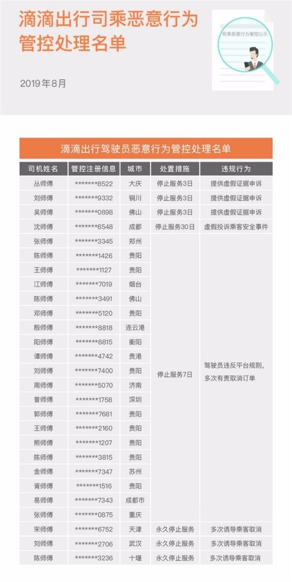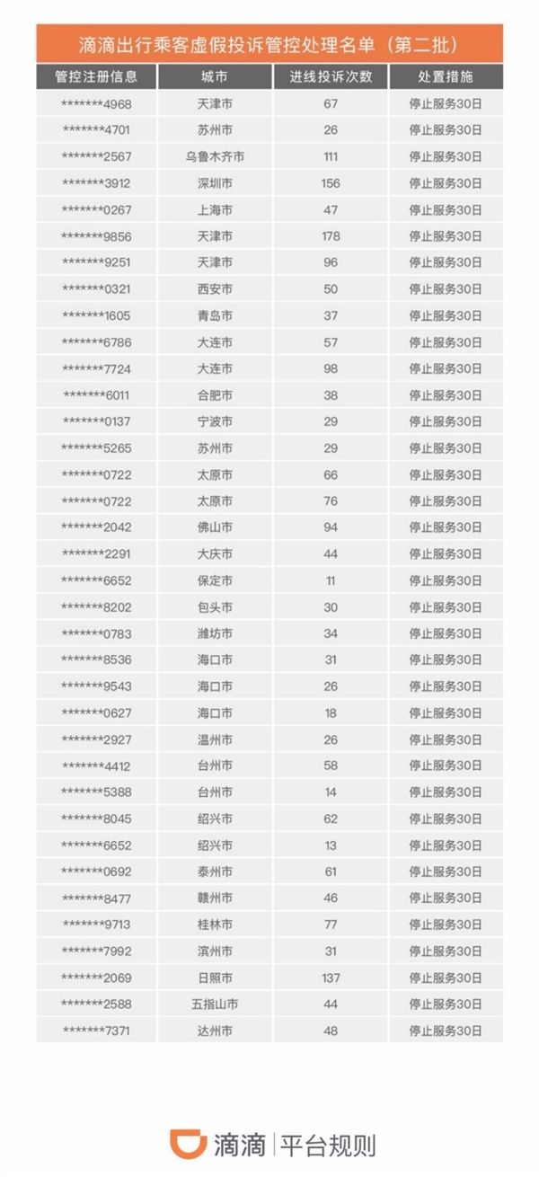 司机中,提供虚假证据申诉的3人,停止服务3日;虚假投诉乘客安全事件的1人,停止服务1日;违反平台规则、多次有责取消订单的20人,停止服务7日;多次诱导乘客取消的3人,永久停止服务。