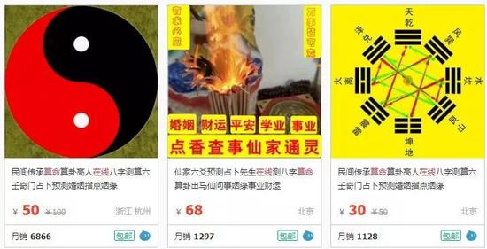 在淘宝上搜索关键词“算命”,有超过一百页相关商品。不少商品还打着“不满意全额退款”的招牌,名列前茅的几家销量都过千,排名第一的店家销量达到了10000+。而算命的收费也根据顾客不同的需求有所不同,价格大都在几十元到几百元不等。有网店在醒目位置提示先看前事,再看未来,看得准再付钱。