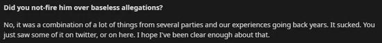 在Reddit上,《林中之夜》的主创之一斯科特·本森(Scott Benson)在在众筹网站上更新了一段话,表示佐伊对艾历克的指控并非毫无依据。