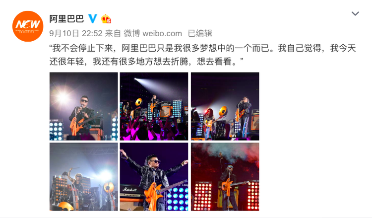 阿里巴巴的官方号在发这些图片是也转载了一些马云的话,马云说“我今天还很年轻,还有很多地方想去折腾,想去看看”,唱《怒放的生命》恰巧也就印证了这一点。