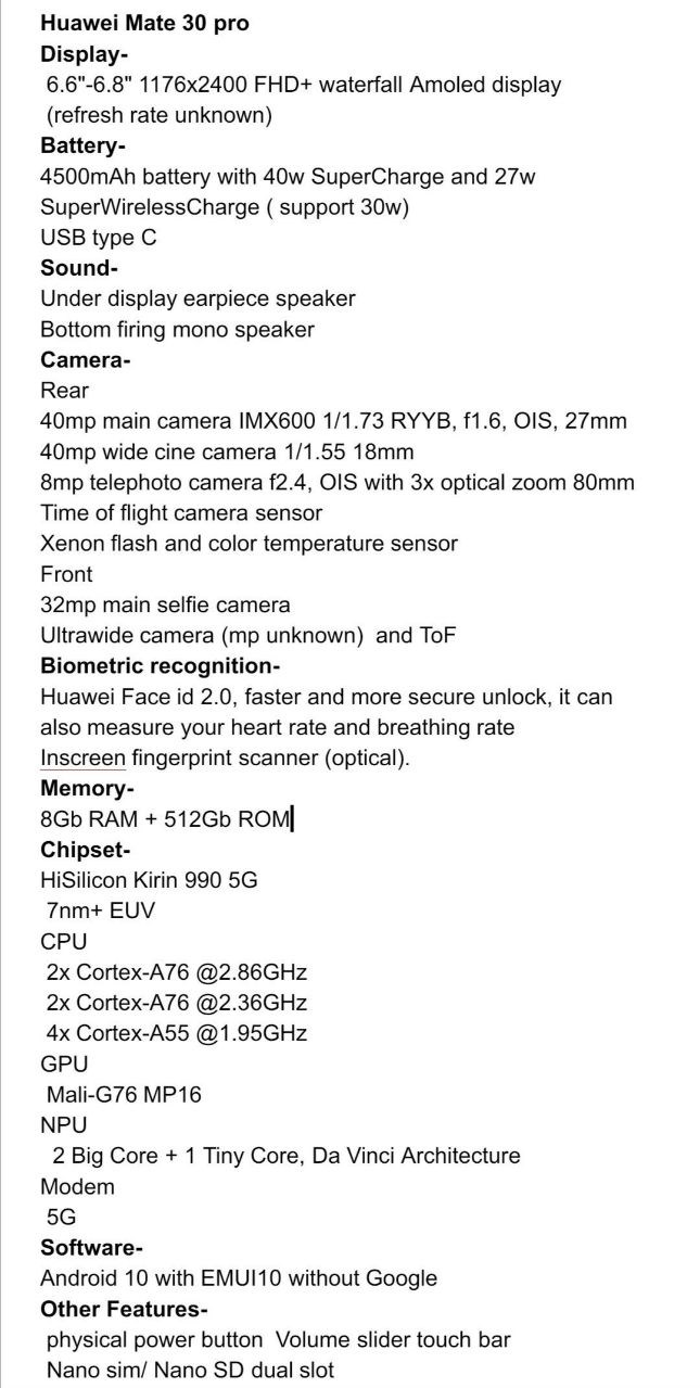 今日推特爆料达人Teme曝光了华为Mate 30 Pro的详细配置,我们来看一下吧。