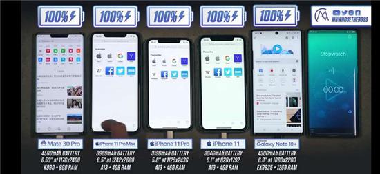 9to5mac对iPhone 11、iPhone 11 Pro、iPhone 11 Pro Max、华为Mate 30 Pro、三星Galaxy Note 10+进行了续航测试。测试内容为反复完成Instagram、相机、3D游戏、音乐流媒体和Shazam等任务,直至手机关机。