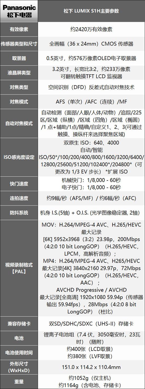松下S1H主要参数: