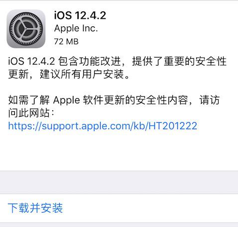 iOS 12.4.2 包含功能改进,提供了重要的安全性更新,建议所有用户安装(需要越狱的玩家请不要安装本次更新,已确认12.4版本的越狱漏洞被修补)。