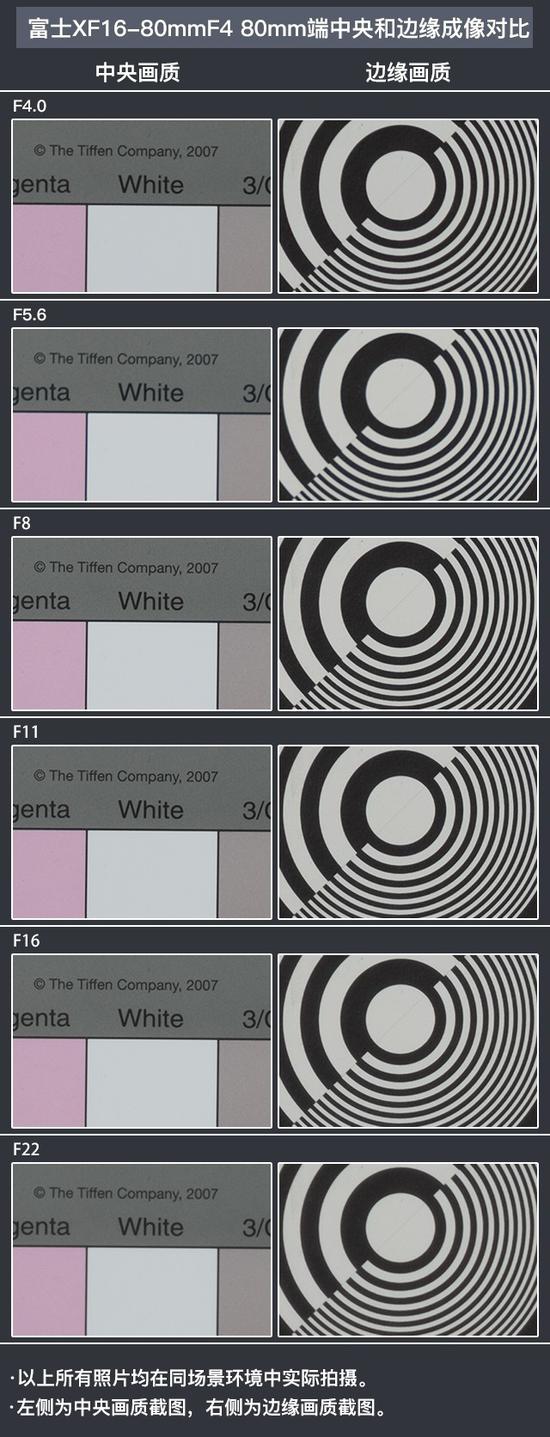 在80mm长焦端的测试中,我们可以看到实际上从中央画质到边缘画质上,F4-F16光圈下的锐度表现都很出色,而F22光圈下锐度有轻微下降,不过仍然在可以接受的范围内。也就是说如果大家使用80mm长焦端拍摄,使用F4-F16光圈进行拍摄都是毫无问题的。