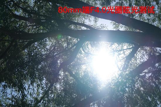 通过测试可以看到,富士XF16-80mmF4 R OIS WR在16mm广角端的眩光抑制比较出色,但是在80mm长焦端的表现比较普通。当然我们测试的环境是比较极端的,选择在正午太阳直射的环境下直接朝向太阳拍摄,一般用户的使用环境中,很少会遇到这种情况,因此大家不用担心使用中的眩光问题。