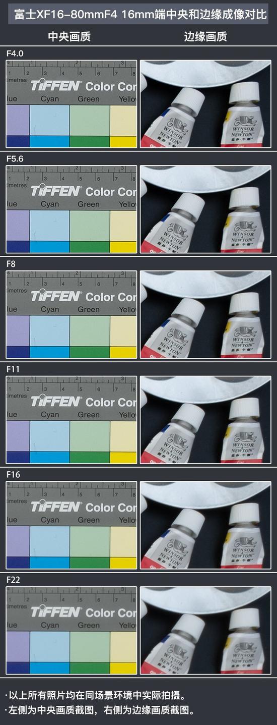 在16mm广角端的测试中,我们可以看到从F4光圈一直到F11光圈,富士XF16-80mmF4 R OIS WR镜头的锐度表现都很好,包括中央画质和边缘化之。但是从F16光圈开始,锐度方面就有了下降,F22的光圈下,锐度下降开始非常明显。也就是说日常我们使用镜头的F4-F11光圈,是完全没有问题的。