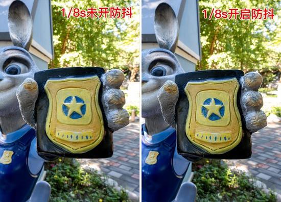 在对比的时候,我们采用手持拍摄的方式,分开拍摄防抖开启和关闭的实测照片。为了能够测试防抖效果,我们选择了1/8秒的快门速度,搭配ISO 160和F10的光圈数值。可以看到,开启和关闭防抖的效果差距很大。开启防抖之后,即便是如此低的快门速度也可以轻松保证手持拍摄的成功率,可以说这个6.0档的防抖效果在拍摄照片和视频时都很实用。