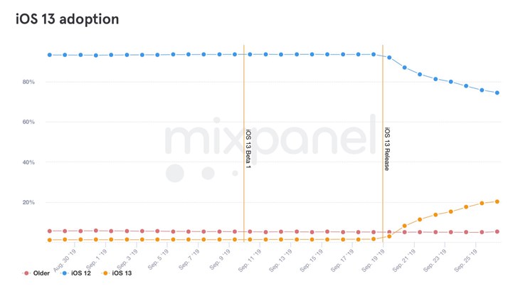 苹果9月20日正式发布iOS 13系统更新,现在似乎有了不错的开端。根据Mixpanel的数据,一周之后,iOS 13在iPhone、iPad设备上的采用率超过了20%。