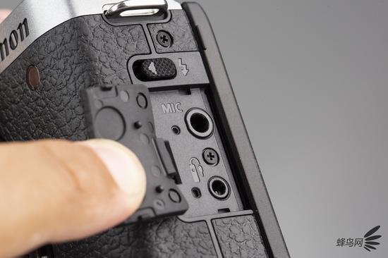 佳能EOS M6 Mark II在机身左侧配置了3.5mm麦克风接口和遥控器接口,右侧则配置配USB Type-C接口和Micro-HDMI接口,USB Type-C接口兼具数据传输和充电功能。