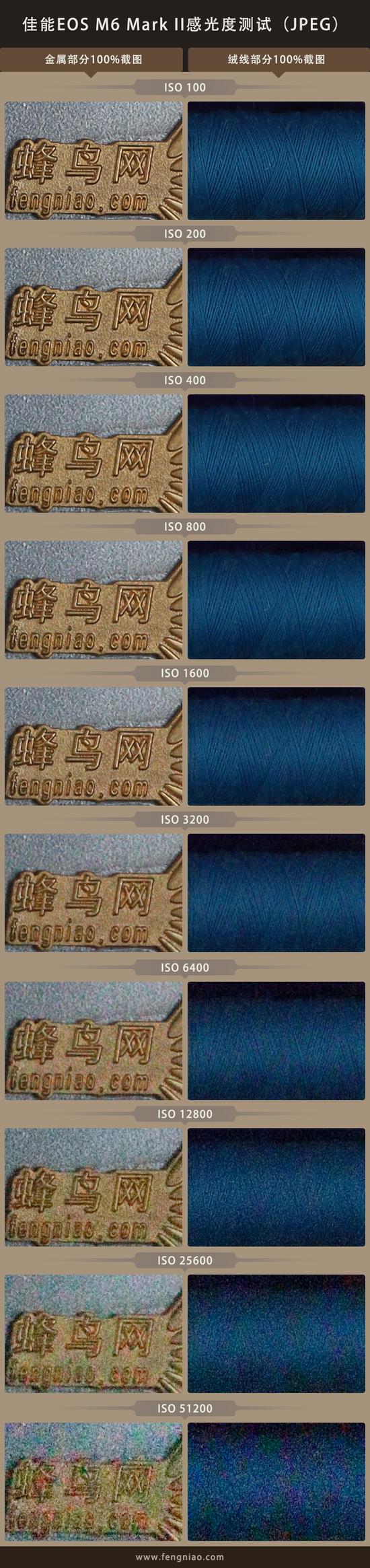 佳能EOS M6 Mark II搭载了佳能EOS 90D相同的一块3250万像素APS-C画幅传感器。伴随着像素数的增加,会不会对画质,特别是高感层面会不会有影响呢?相比较于佳能EOS M6,佳能EOS M6 Mark II换装了DIGIC8处理器,新的处理器对于成像的影响会怎样呢?在下面的测试中,我们默认关闭了机身的高ISO感光度降噪功能等其它优化功能,使用固定机位进行拍摄。分别从相机直出的JPG图片和通过电脑将RAW文件导出的JPG文件中截取100%大小的截图进行对比。