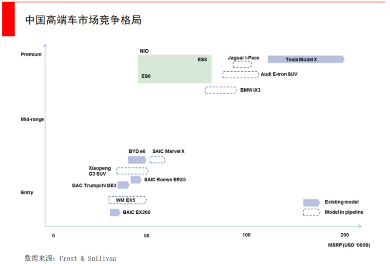 蔚来跟特斯拉一样,自上而下依次推出产品,先推高端车型,再逐步下探至中低端市场,这种打法的好处是能享受先发优势,积累品牌溢价。但坏处也很明显,早期的高端市场比较小众,销量很难突破,成本高居不下(市场费用一度超过豪华汽车品牌法拉利),但随后推出的能够走量的中低端车型,又开始面临与传统车企的激烈交锋。