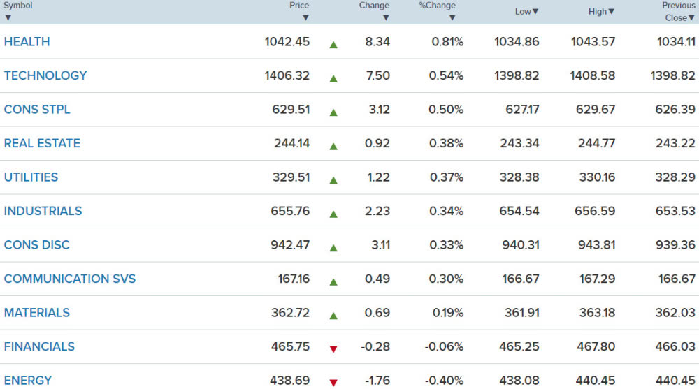 标普500指数11个板块中有9个板块上涨,2个板块下跌。其中,医疗保健板块领涨,能源板块领跌。