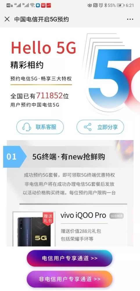 中国电信官方表示,预约成功用户,于2019年12月25日前办理5G套餐可以享受5G套餐折扣特权,网龄3年及以上享七折优惠,3年以下及新用户享八折优惠,折扣连续享受6个月。此外,用户可以享受华为、vivo 、中兴、三星等热门5G手机专属优惠,价格比手机厂商官方定价低100-500元不等,用户购买手机终端成功后还可免费领取100 GB流量;用户还可享受海量5G靓号专属购买权。