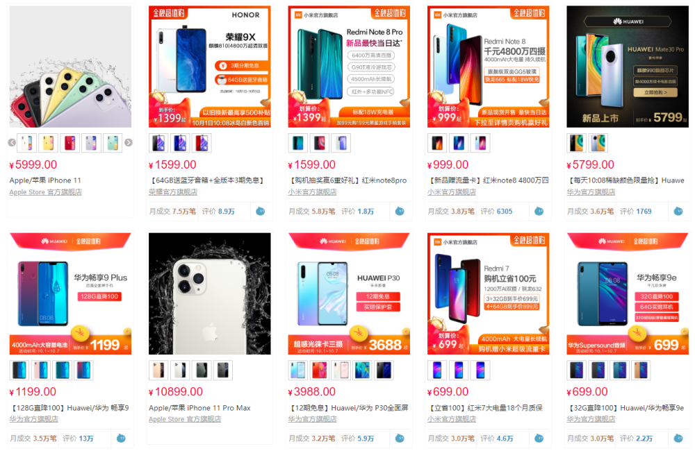 天猫方面,按月销量排列iPhone 11也位居第一,但由于苹果的关系无法看到具体销量。荣耀9X则以7.5万台位居第二;华为Mate 30 Pro月销量3.6万台,位居第五。
