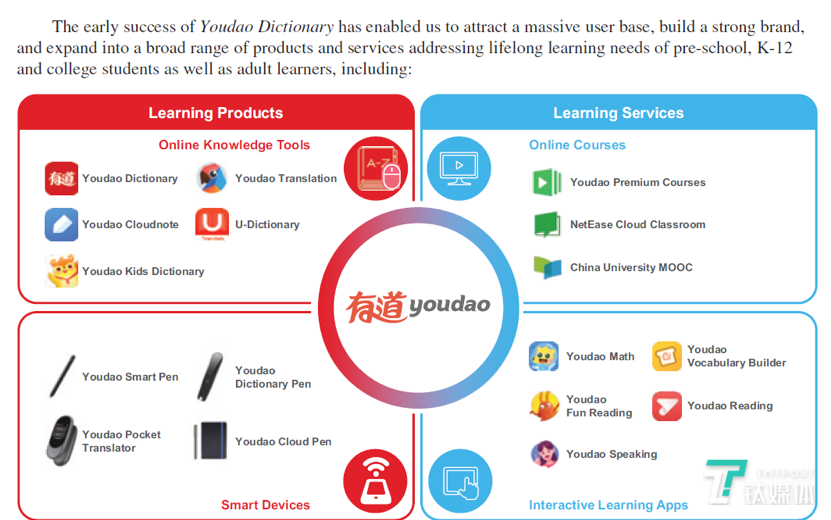 早期,有道词典的成功为有道奠定了大量的用户基础,建立了强大的品牌。在此基础上,有道扩展出一系列产品和服务,以满足学前、中小学、大学生及成人的终身学习需求,其中包括4大类别: