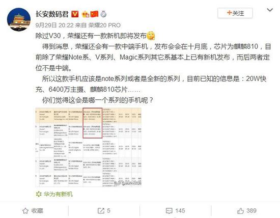 除了曝光荣耀V30之外,知名数码博主@长安数码君还曝光荣耀将在十月底发布中端机型型号为LRA-AL00,目前通过3C认证,这款手机可能是note系列或者是全新的系列,根据目前已知消息来看,新机支持6400万像素主摄,支持20W快充技术,搭载麒麟810芯片。
