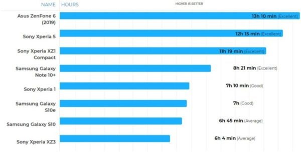 信息显示,索尼Xperia 5续航时间为12小时15分钟、索尼Xperia 1续航时间为7小时10分钟、索尼Xperia XZ3续航时间为6小时4分钟、索尼Xperia XZ2续航时间为8小时54分钟、索尼Xperia XZ1续航时间为7小时44分钟、索尼Xperia XZ Premium续航时间为8小时15分钟、索尼Xperia XZ续航时间为6小时41分钟(同一基准测试)。