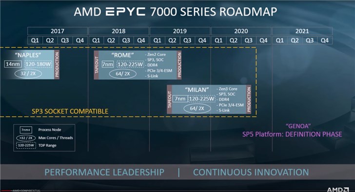Zen 4架构的热那亚霄龙处理器,AMD表示,现在目前热那亚架构已经处于定义阶段,目前确认的有SP5插槽,而PCIe 5.0和DDR5暂时没有确定。预计将在2021年某个时间公布。