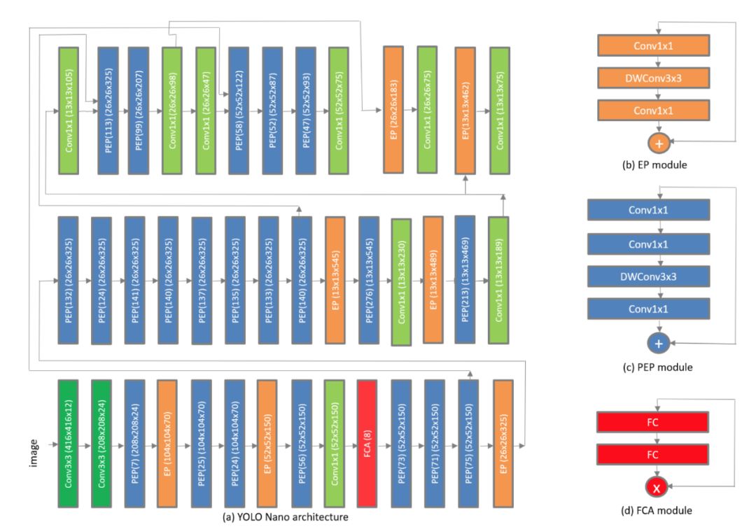 图 1:YOLO Nano 神经网络架构。注意其中 PEP(x) 表示残差 PEP 模块第一个映射层的 x 通道,FCA(x) 表示降维率为 x。