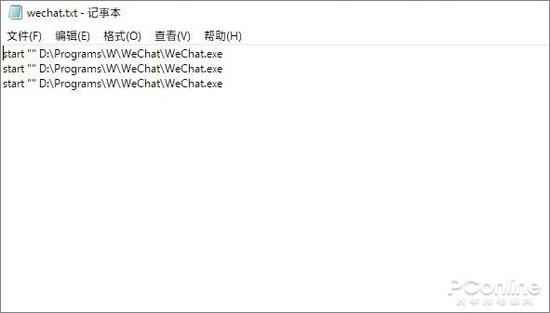 3、在记事本中输入命令“start “” ”(注意必须得是英文引号),然后将刚刚复制的微信路径Ctrl+V粘贴到代码后面;