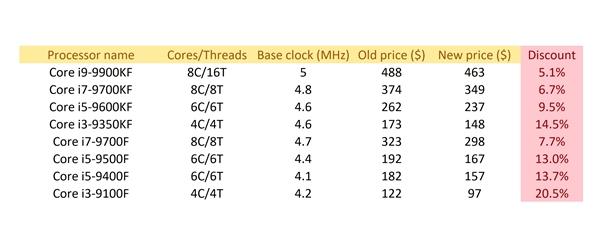 另据雷锋网了解,英特尔也在近日宣布不带核显的第九代酷睿“F”“KF”降价,降价幅度最高接近21%。