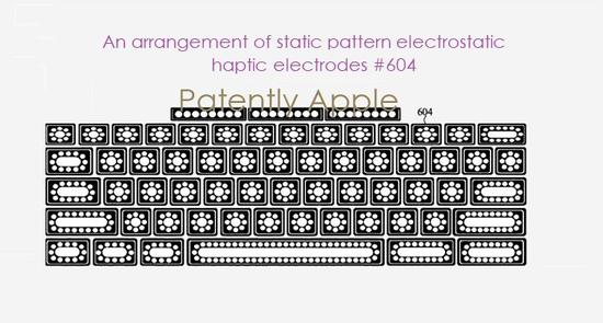 专利是关于苹果未来的一种新型触觉系统。该系统使用了一种被称为 Static Pattern Electrostatic Haptic Electrodes(静态图案静电触觉电极)的技术,它能让人们抛弃物理键盘,让屏幕上的虚拟键盘就具有真实的触感。