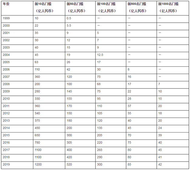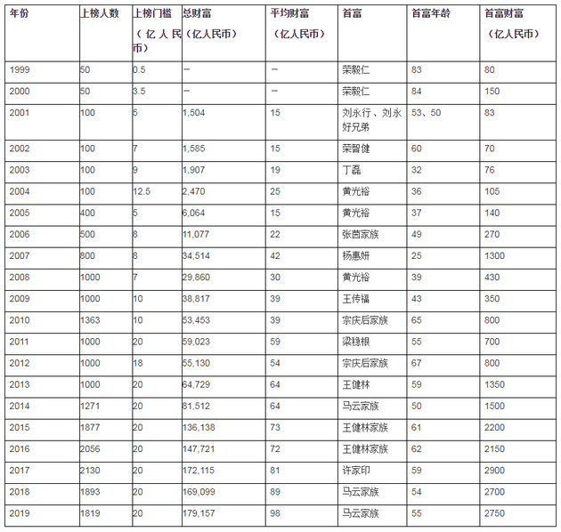 新浪科技讯 10月10日上午消息,胡润研究院发布2019胡润百富榜。今年是胡润研究院自1999年以来连续第21次发布“胡润百富榜”,上榜门槛连续第七年保持20亿元。上榜企业家财富计算的截止日期为今年8月15日。