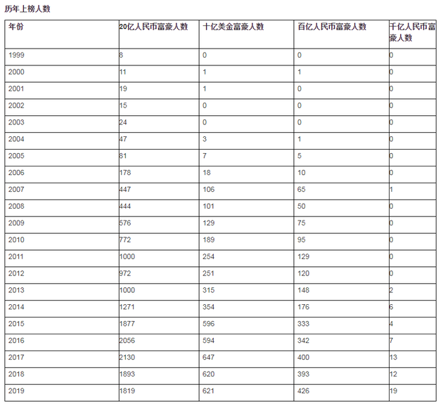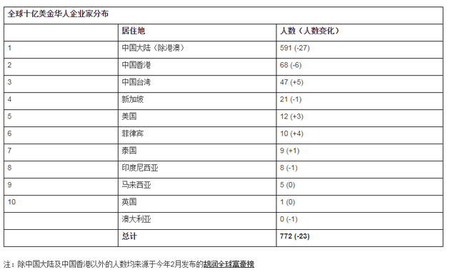 《2019 LEXUS雷克萨斯·胡润百富榜》上共有621位十亿美金企业家,其中华人企业家有618位,另外3位是非华人。结合今年胡润全球富豪榜综合统计,目前有772位华人企业家财富超过十亿美金,其中68位居住在香港,47位居住在台湾,66位居住在国外,591位居住在中国大陆(除港澳)。胡润表示:“中国人占世界人口的20%,但拥有全球三成的十亿美金企业家,远远超过其他任何国家。”