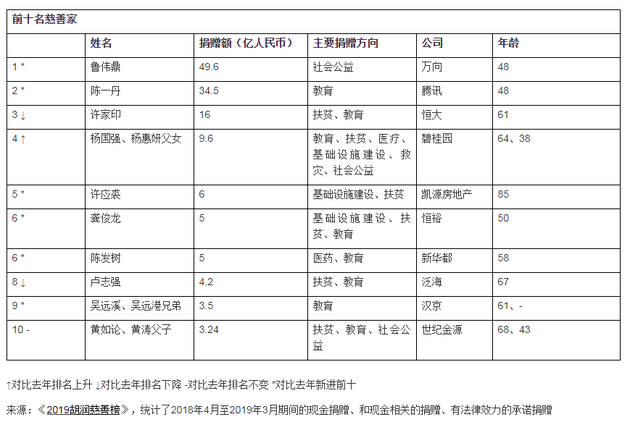 万向集团接班人,48岁的鲁伟鼎今年以49.6亿捐赠额成为中国首善,目前鲁伟鼎家族以365亿财富位列LEXUS雷克萨斯•胡润百富榜第75位,今年7月,在万向集团成立50周年之际,鲁伟鼎宣布依照父亲鲁冠球的意愿,将万向集团公司截至2018年度审计报告的资产,全部捐赠设立鲁冠球万向事业基金。公益基金的全部收益将用于研发新技术,高端人才教育,开展科技研究,支持设立理工类应用型科研机构。目前相关捐赠工作正在进展过程中。