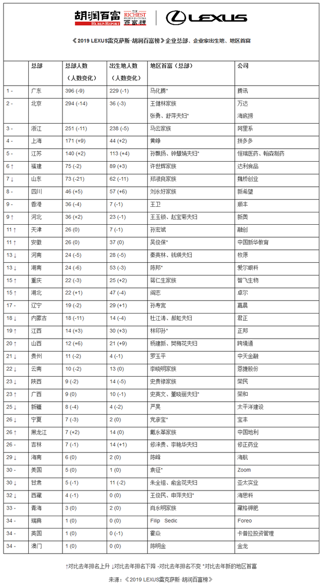 来源:《2019 LEXUS雷克萨斯·胡润百富榜》企业总部、企业家出生地、地区首富