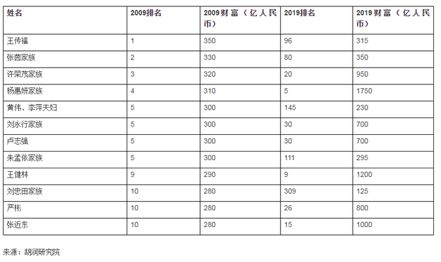 十年前排名前十的企业家中,还有两位如今仍在前十名之列:杨惠妍家族和王健林,其他大都还在前100名中。