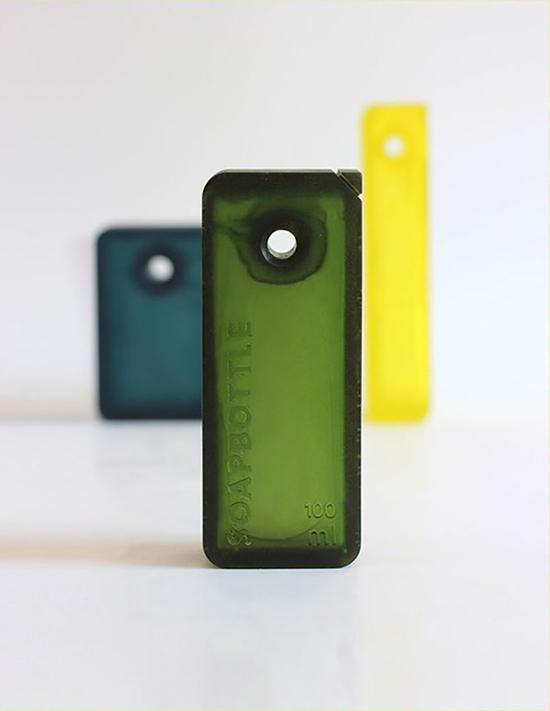 jonna breitenhuber设计的SOAPBOTTLE 在设计中加入了无包装化妆品的概念,具体方式是将产品本身变为其自身的包装。采用天然材料制作的香皂具有可生物降解的特性,因此可以完全避免垃圾产生。当SOAPBOTTLE 内盛装的产品用光后,香皂外包装也会逐渐溶解。香皂瓶剩下的部分还可以当作洗手香皂使用,或是再次加工成其它洗涤剂或清洁剂使用。