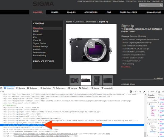 而近日外媒曝光,在适马官方网站的源代码里暗藏了fp的售价信息,在“price”,即价格一行中,后面的数字为1899。故外媒推测适马fp这款全画幅无反机身的价格为1899美元,约合人民币15370元。