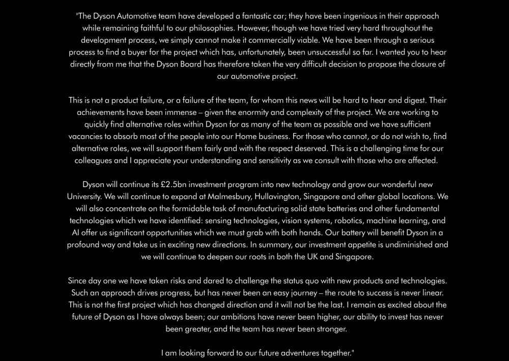 戴森创始人詹姆斯·戴森的内部信称:“这不是产品失败,也不是团队失败。” 事实上,戴森已经成功开发出了原型车,产品非常符合戴森的理念,但可惜在商业上并不可行。