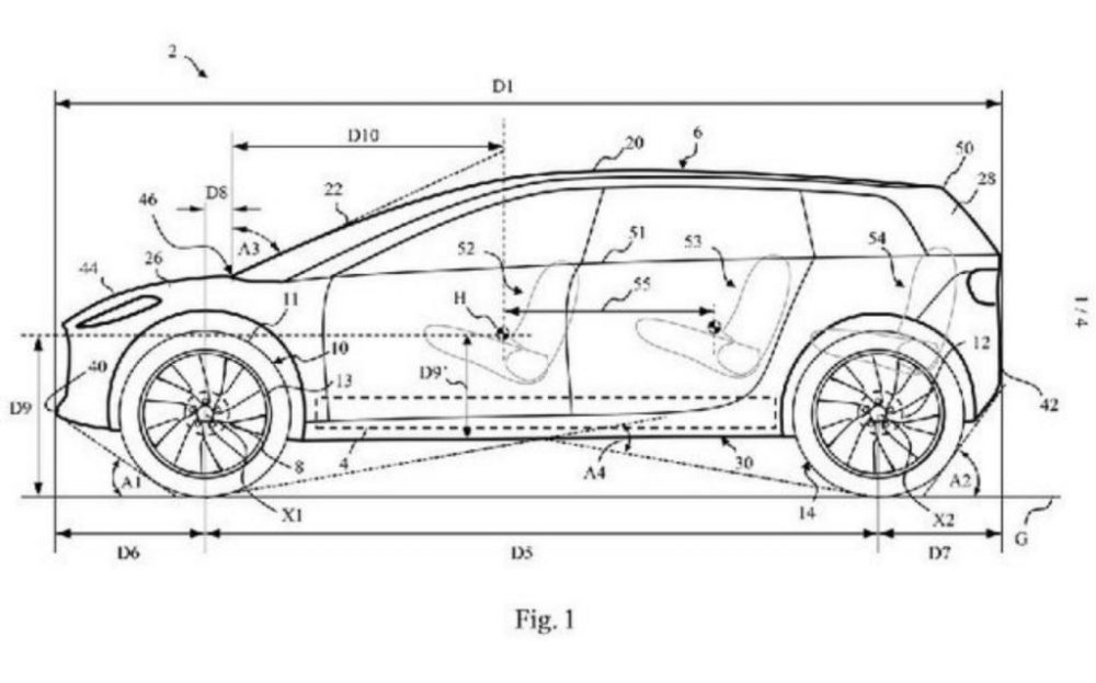 从图纸上看,这明显是一台 SUV 车型,三排座布局。车长 5 米左右,车高 1.65 米,比很多 SUV 都要低,而轴距则达到了可怕的 3.3 米,极为倾斜的前挡风向风阻妥协,整车看起来偏向 MPV 的造型。