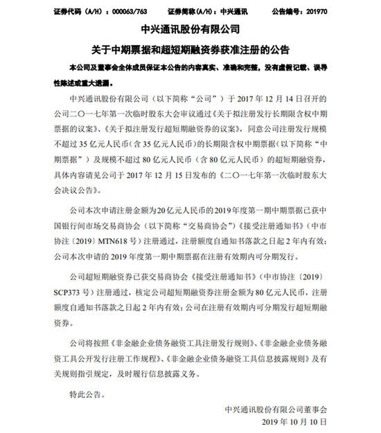 腾讯科技讯 10月11日消息,中兴通讯发布公告称,公司20亿元人民币中期票据和80亿元超短期融资券已获交易商协会注册通过。注册额度自通知书落款之日起2年内有效,可分期发行。